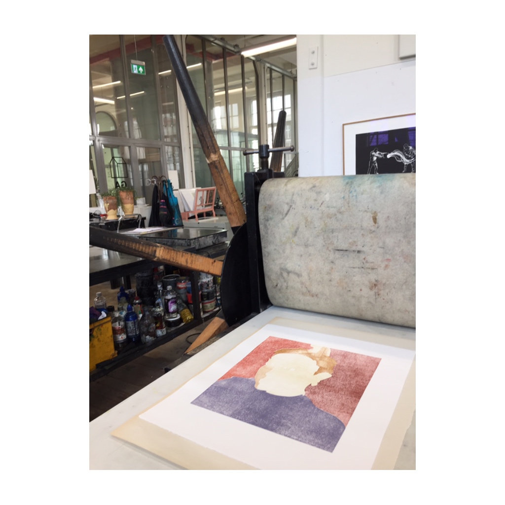 Deze maand werk ik op een middelgrote pers (60 x 100 cm) in het Grafisch Atelier Den Bosch aan een nieuwe prent. Het mooie, lichte atelier bevindt zich in de Willem II Fabriek.