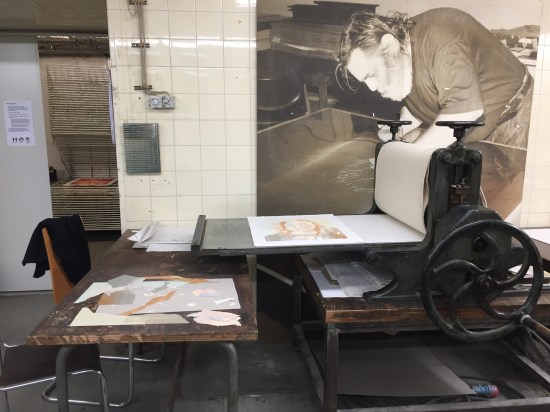 Deze maand werk ik op een middelgrote pers (60 x 100 cm) in het Grafisch Atelier Den Bosch aan een nieuwe prent. Het mooie, lichte atelier bevindt zich in de Willem II Fabriek.